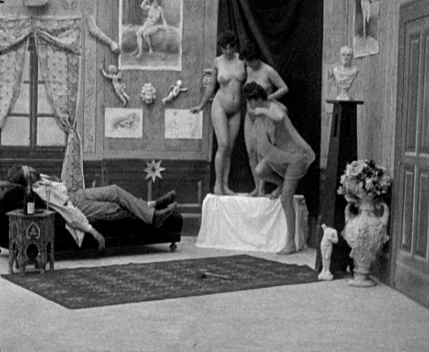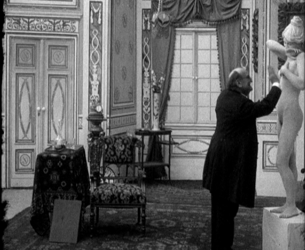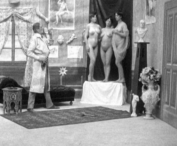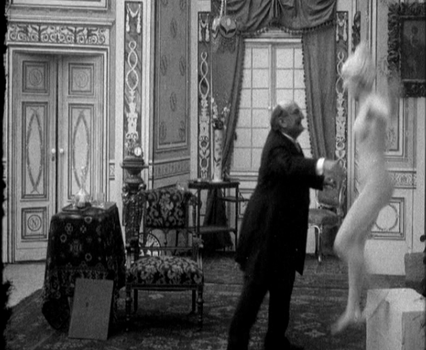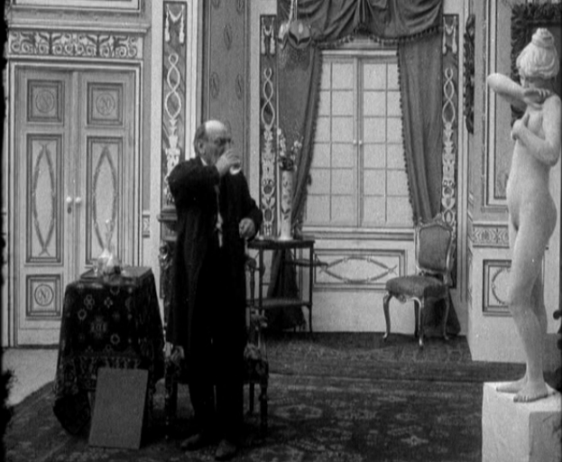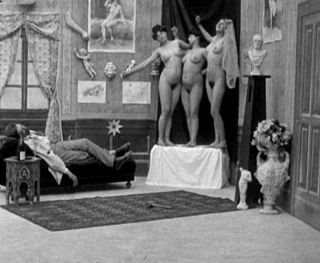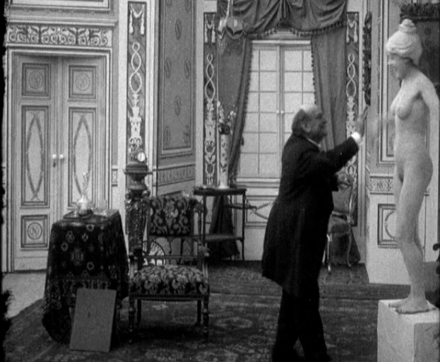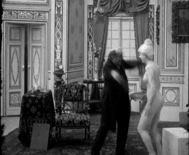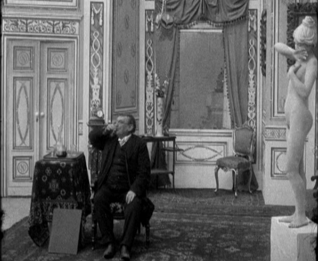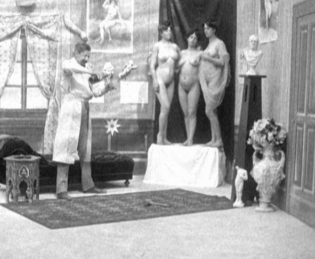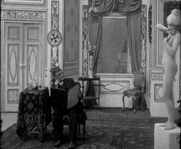 The Artist’s Dream WATCH ON YOUTUBE (new link in original 4:3 ratio) A sculptor is putting the finishing touches to his statue of The Three Graces. After making a few adjustments he steps back to admire his work, then drinks a toast to the statue, has a smoke and takes a nap on his couch. While he’s asleep the three figures come to life, step down off their pedestal and gingerly approach him. Finally one of them plucks up the courage to give him a kiss. Then they return to their pedestal and freeze once more. When the artist wakes he pleads with the statue to come to life again, but alas, it was all just a dream, and there’s nothing he can do but to carry on sculpting.
