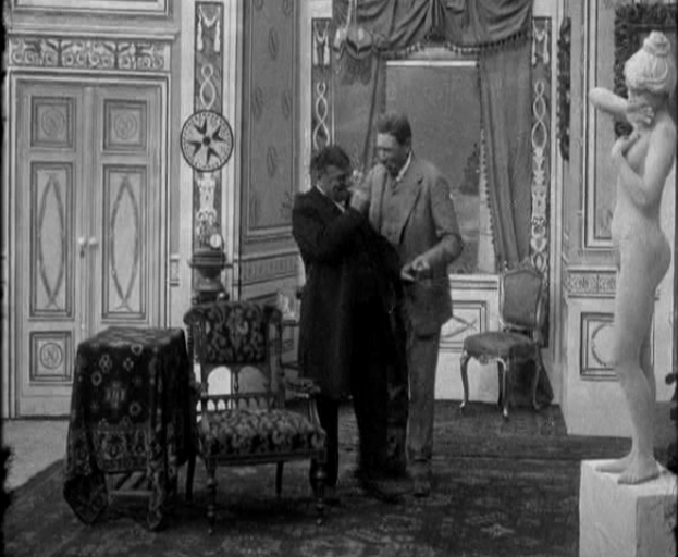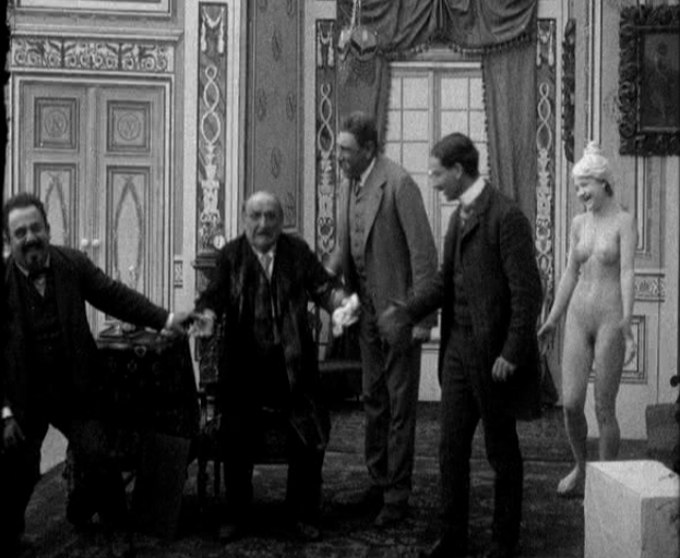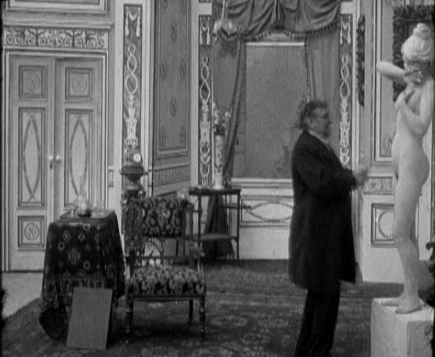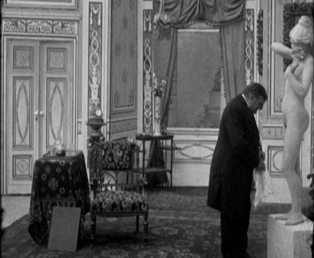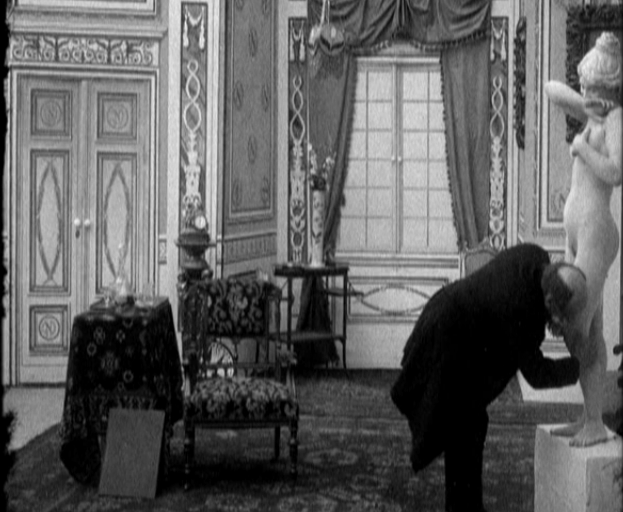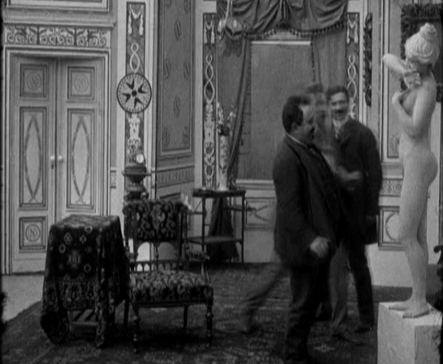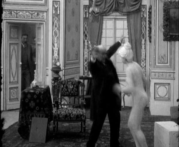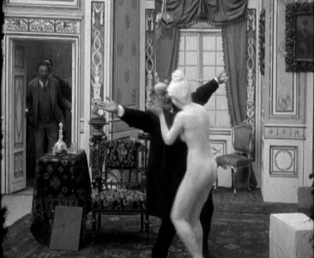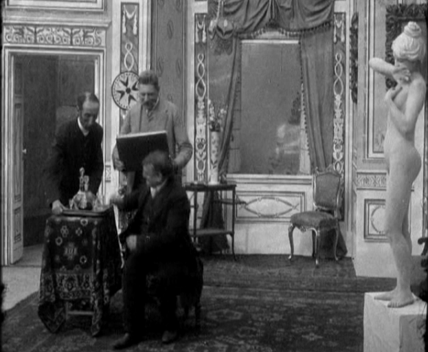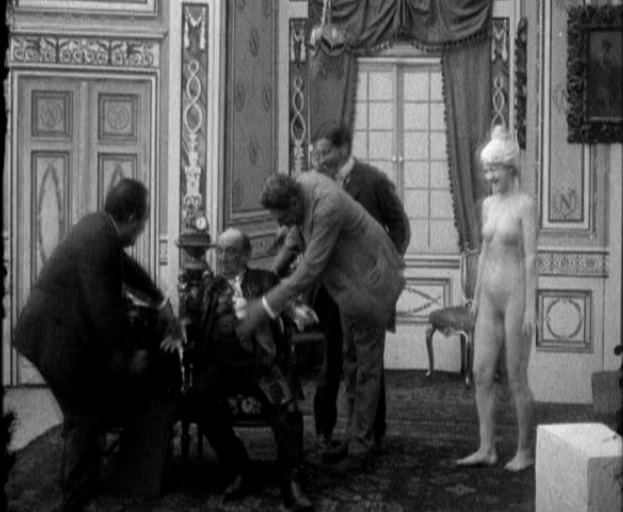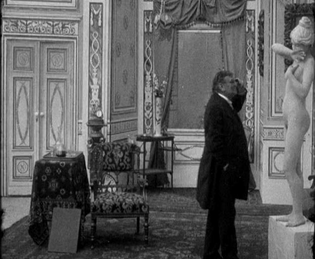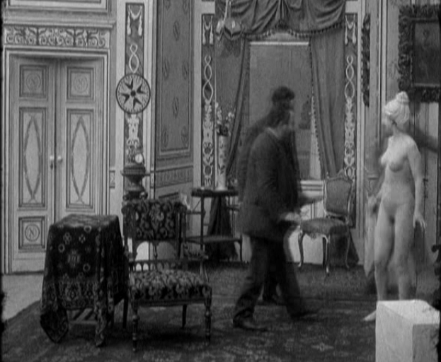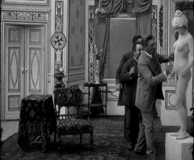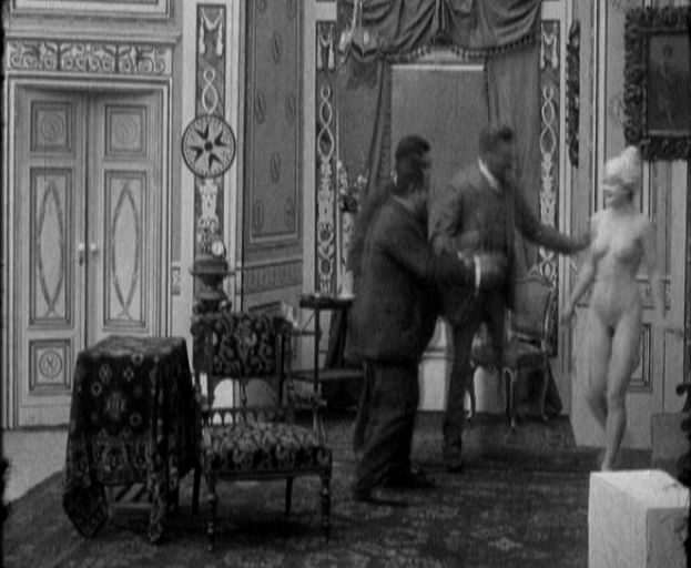Living Marble A group of men decide to play a joke on a colleague. Persuading a demure young lady to strip off and pose as a statue (with the help of a little flour, apparently) they leave the gentleman alone with her. Sure enough, after a little while he can’t help inspecting the statue up close (after first checking to make sure no one’s looking!), and eventually gets quite hands-on... at which point, of course, the game is up. My only real gripe is that the film has poor composition - the statue-girl is right at the edge of the frame, when she should be 1/3 of the way in (which is exactly where the Three Graces are in the previous film). Note also the round decoration on the wall near the door - it’s a Saturn-Film logo, included to discourage piracy. Between screencaps 12 and 13 it falls off the wall.