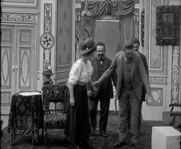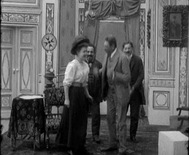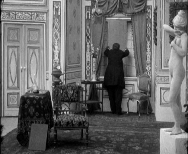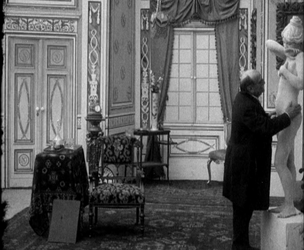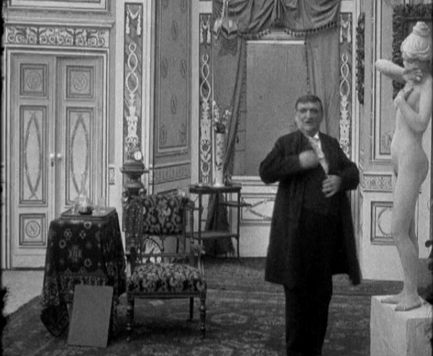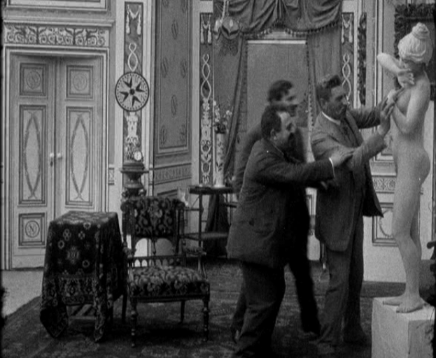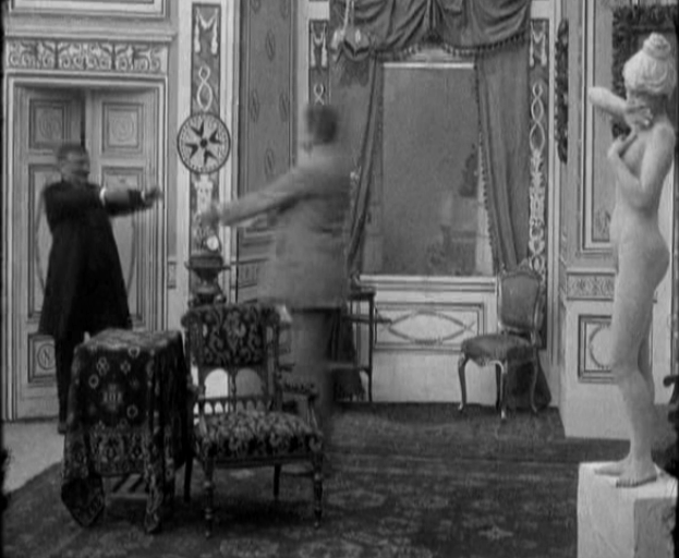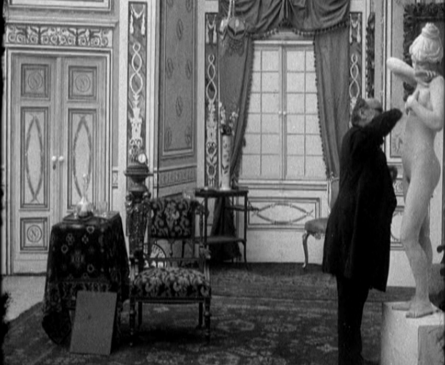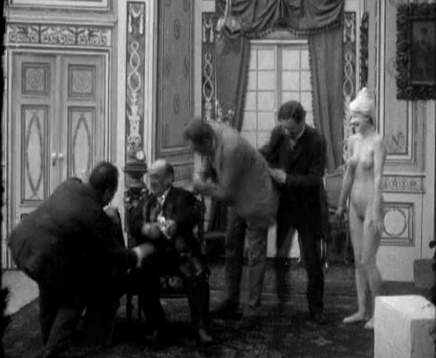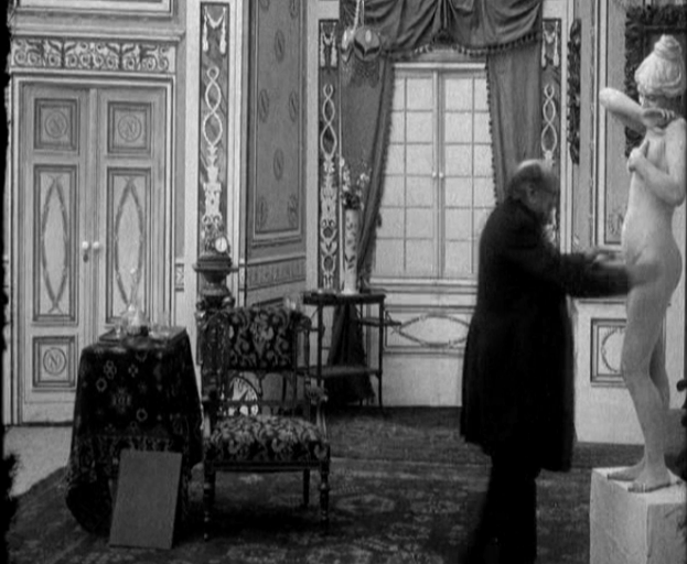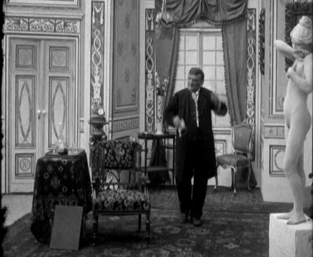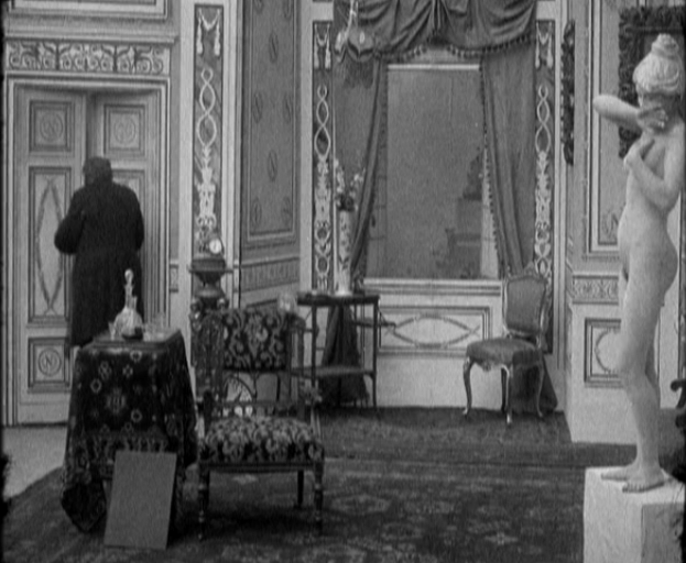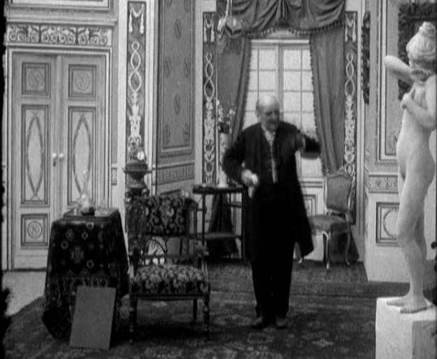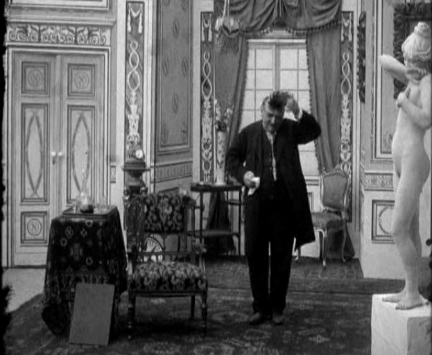 Living Marble A group of men decide to play a joke on a colleague. Persuading a demure young lady to strip off and pose as a statue (with the help of a little flour, apparently) they leave the gentleman alone with her. Sure enough, after a little while he can’t help inspecting the statue up close (after first checking to make sure no one’s looking!), and eventually gets quite hands-on... at which point, of course, the game is up. My only real gripe is that the film has poor composition - the statue-girl is right at the edge of the frame, when she should be 1/3 of the way in (which is exactly where the Three Graces are in the previous film). Note also the round decoration on the wall near the door - it’s a Saturn-Film logo, included to discourage piracy. Between screencaps 12 and 13 it falls off the wall.