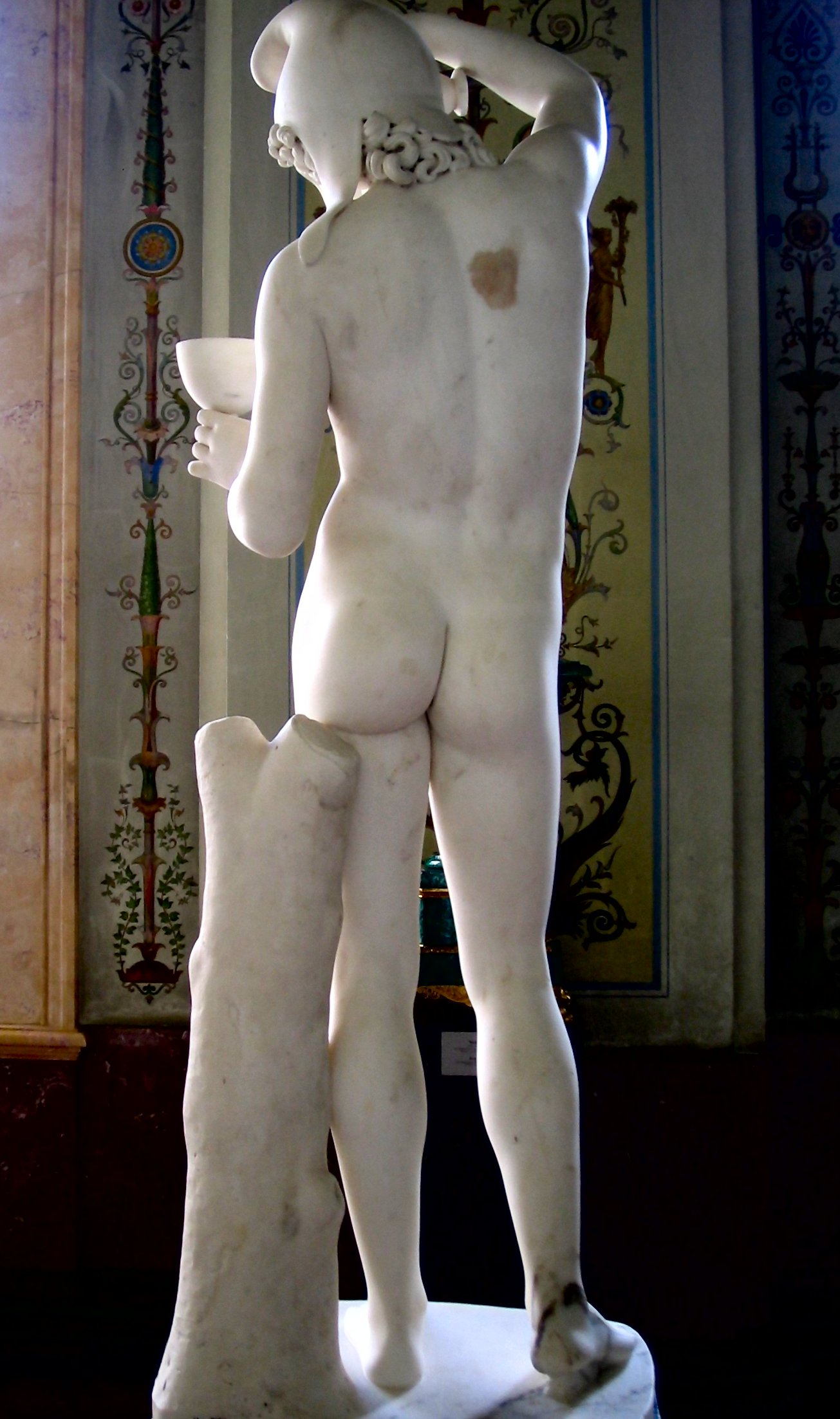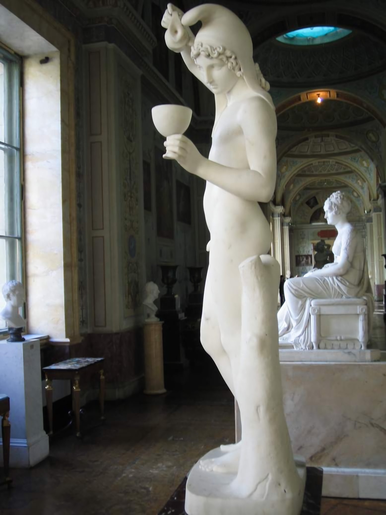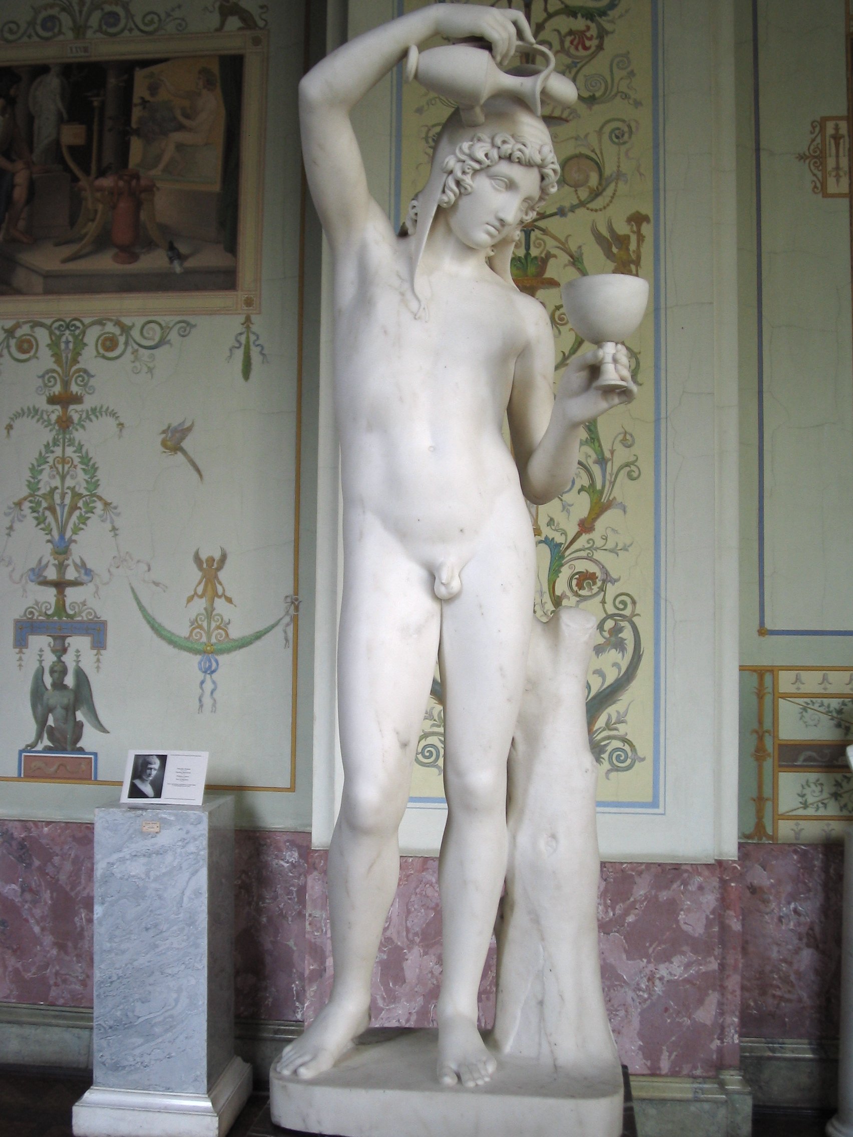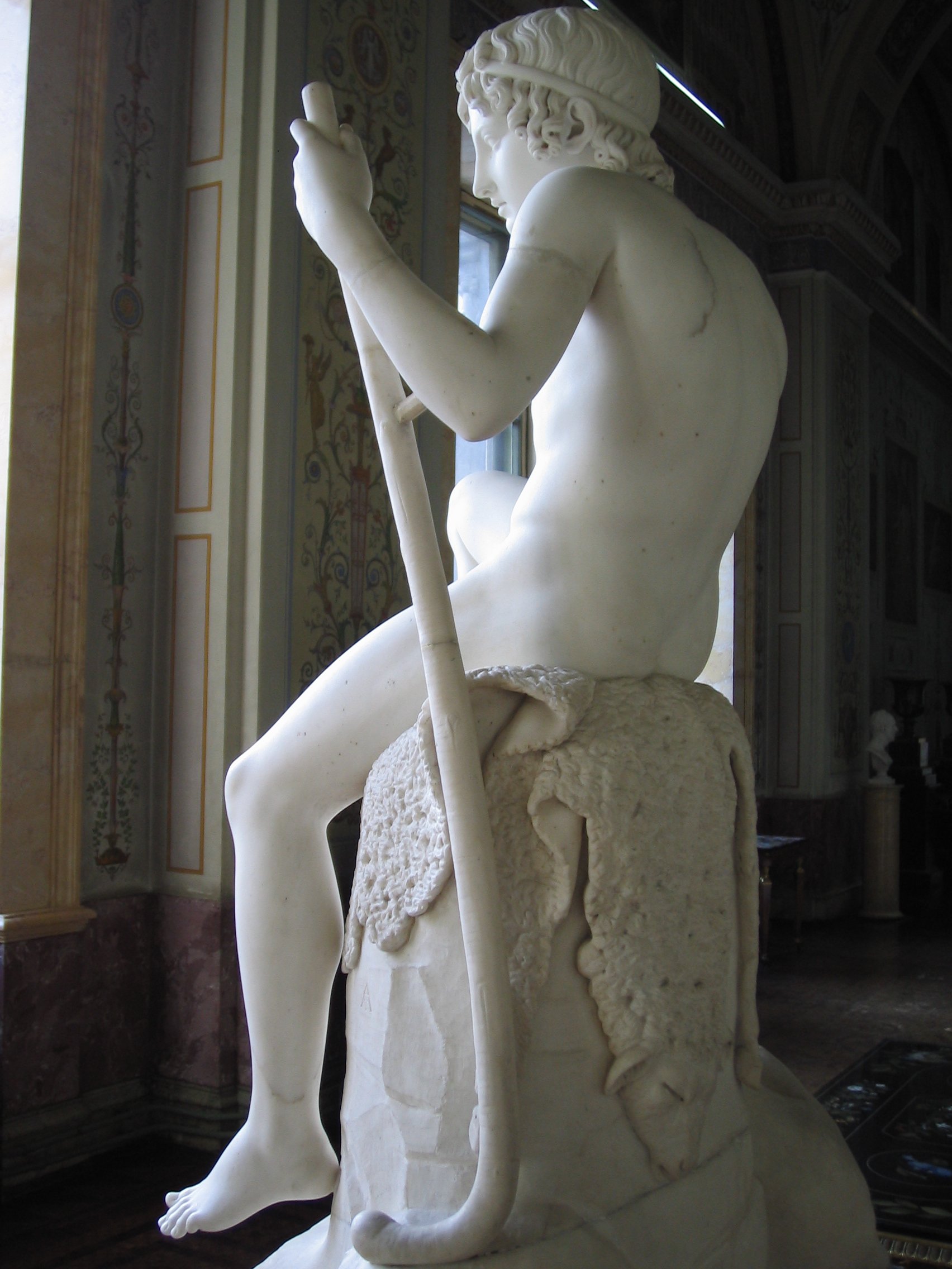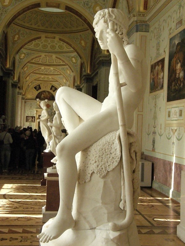 The version in the Hermitage in St Petersburg is thought to be the first carved and bears the distinct marks of an accident at Thorvaldsen’s studio in Rome when the floor collapsed and its head and arm were broken off. I suspect that the now rather obvious breaks were less clear when it was first repaired.