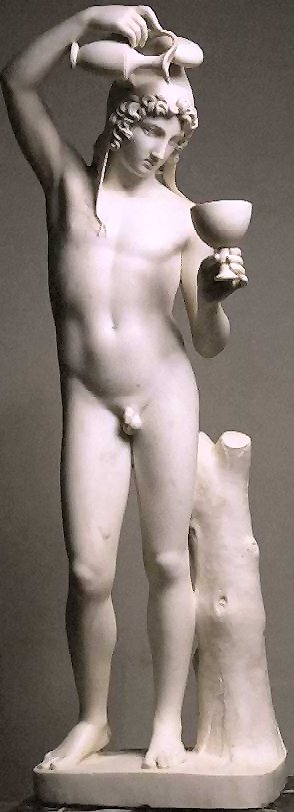 The close-up face shots and amber-lit views against black backgrounds are of the version in the Thorvaldsens Museum, Copenhagen Denmark, photos by groenling on Flickr. The version with the ornate wallpaper and other works of art is in the Hermitage Museum, St. Petersburg, Russia, photos by various hands. The version in the large room with the chandelier and mirror, with panpipes next to the dog's forepaw, is in Drapers Hall, London, England. Two of the colour photos thereof are by Jon (see below), who also took the flashlit back view of the plaster version in the Thorvaldsens Museum, as well as supplying the above portrait of Thorvaldsen posing with the plaster for this statue. Finally you’ll see a couple of sketches of the statue, by Domenico Marchetti and Ignazio Podio. Podio manages to turn the statue’s rather blank expression into a smile, but also insists on adding a fig leaf.