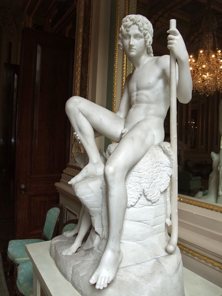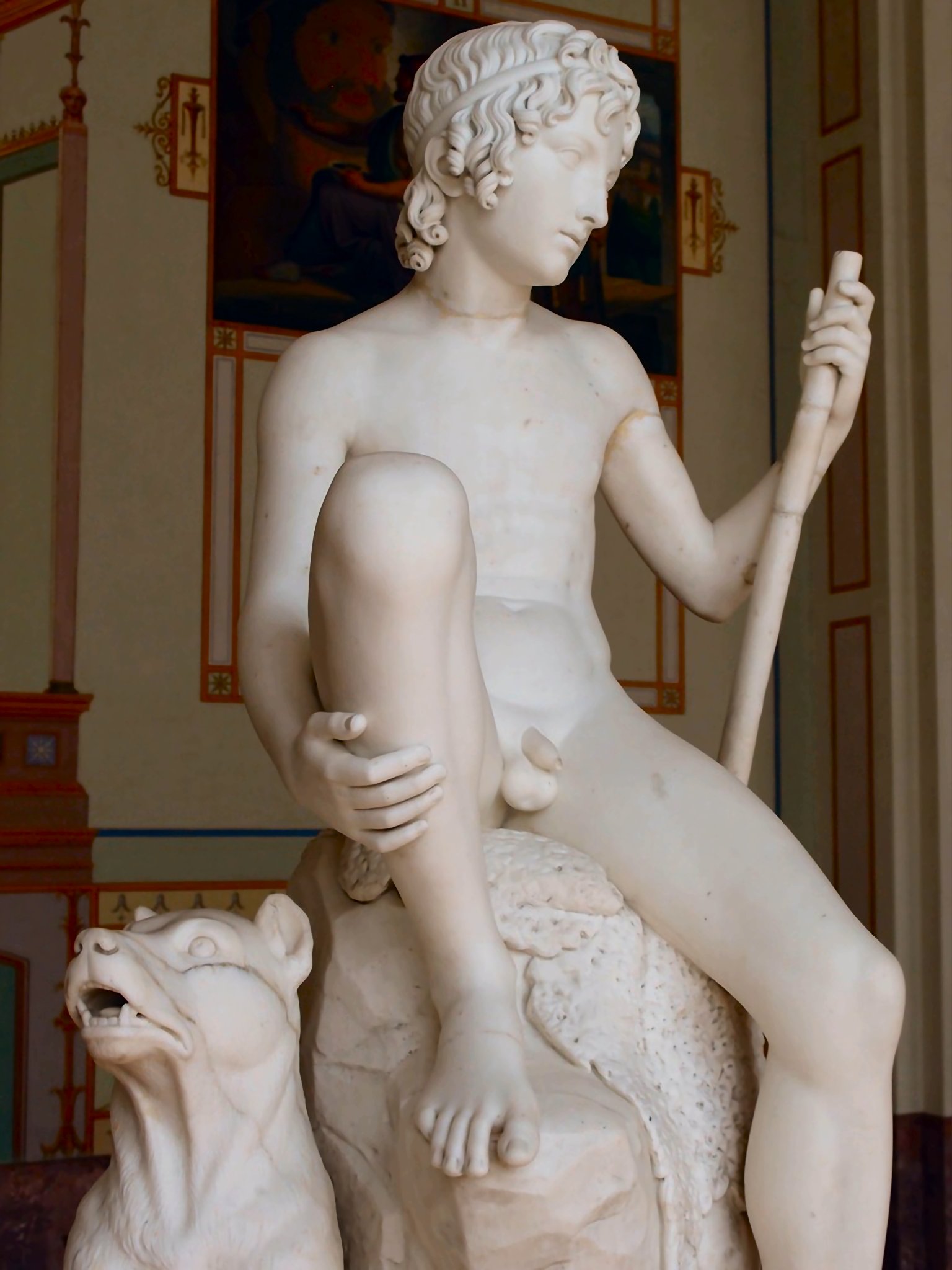 The “Shepherd Boy” is a very unusual subject for Thorvaldsen as there is no mythological or biblical basis for the pose. It’s not clear why he produced it as no original records survive. Producing a statue of a nude youth at this period without a link to Greek mythology such as “Ganymede” or a Biblical subject such as “David” would probably have caused some surprise or even shock. I strongly suspect that the addition of the pan pipes to the version carved for Lord Grantley was to link the figure to the legend of “Pan” who was the God of Shepherds and hunting dogs. The boy isn’t Pan himself but it might have provided enough of a link to classical legend to give the Count an “excuse” for his attractive statue of a naked boy.
