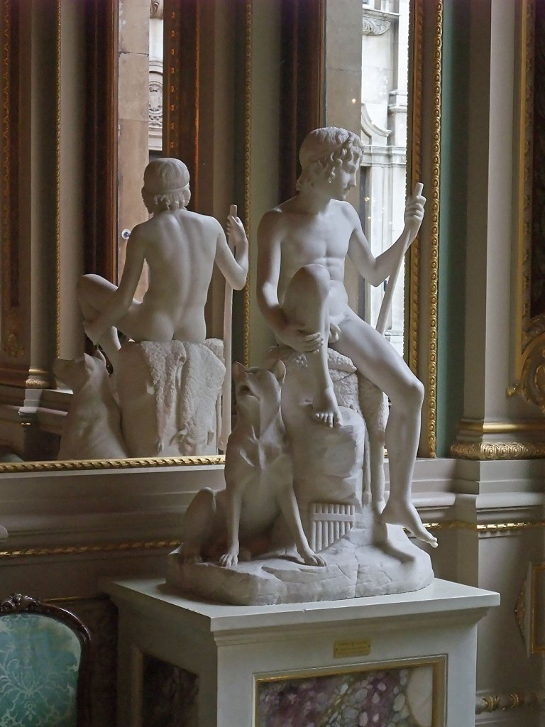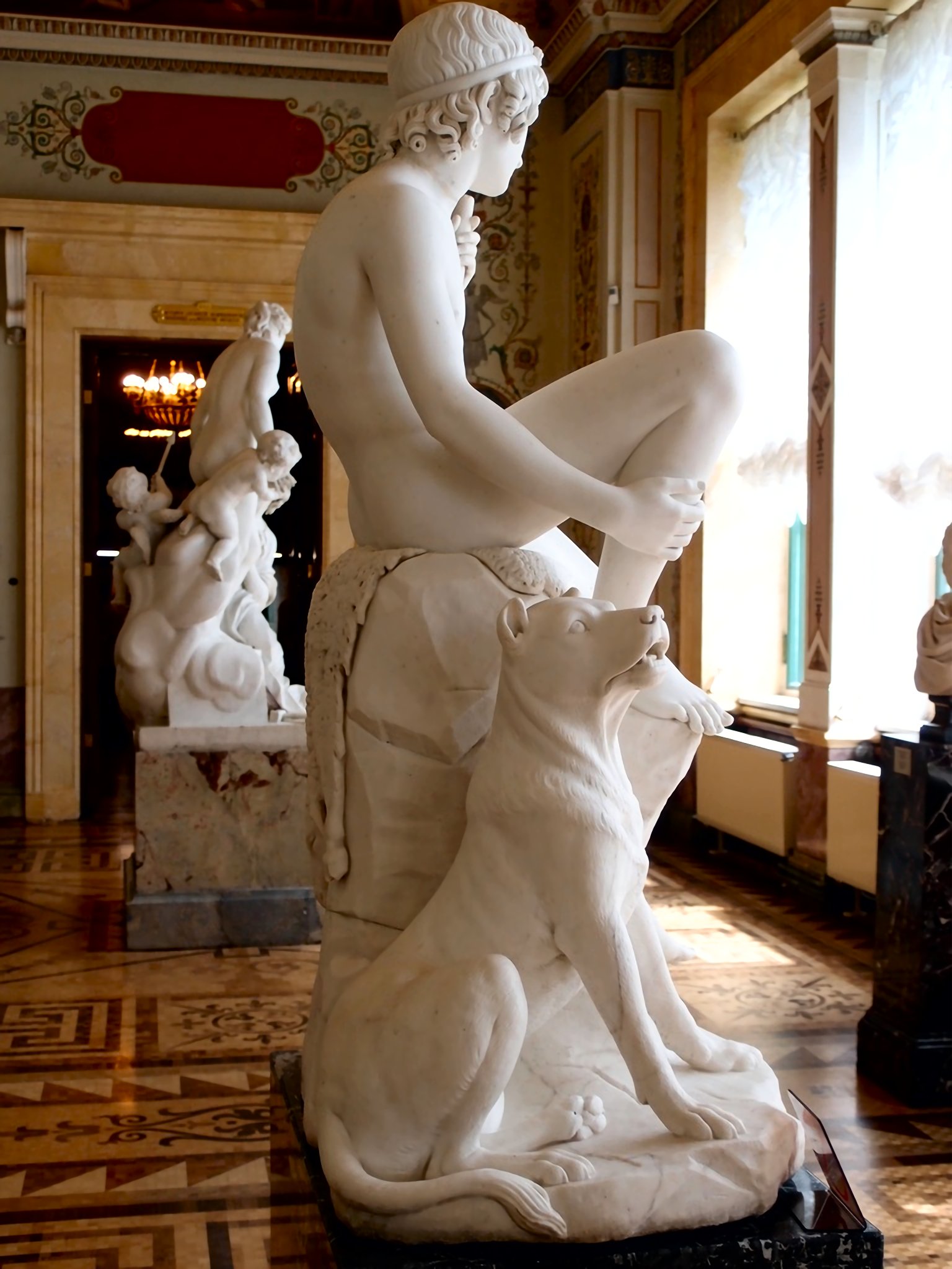 The story that Thorvaldsen carved the statue after his young model took up the pose during a break from modelling for “Ganymede” has been challenged by some writers as apocryphal. As has the claim that it’s Thorvaldsen’s dog as it’s actually a fairly close, mirror image copy, of a Roman sculpture of a dog in the Vatican collection that Thorvaldsen would have known. One writer even claims that the pose of the boy is “known from antiquity” but I’ve been unable to find a nude example.